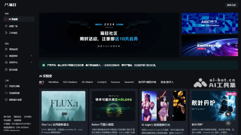 猫目社区是一个AI绘画模型社区和内容创作平台,提供多种AI工具和模型应用,如文本到图像生成、文本到视频生成、视频编辑、面部交换、语音合成、模型训练等。开箱即用,省去创作者安装测试的时间,大大提升创作效率。用户可以在猫目社区分享自己的提示词创意和优秀作品,猫目社区还内置了提示词生成器和解析器,提供图片提示词信息提取功能,为用户提供更便捷的图像生成和内容创作体验。